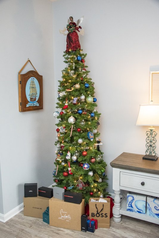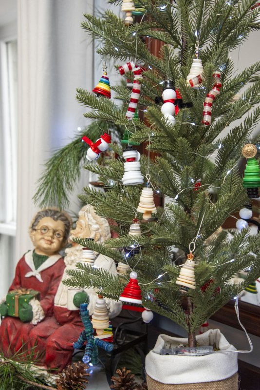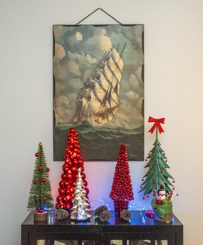 In the kitchen of Peggy and Ed Duckworth’s Mulberry Street home is a shipbuilding-themed tree with a portrait of shipbuilder C.C. Davidson watching from the shadows.