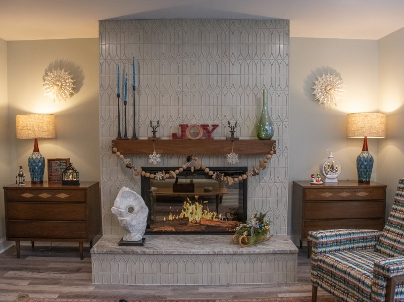 Marla and Tom Norton’s family room features an exotically tiled fireplace among artwork and collections.