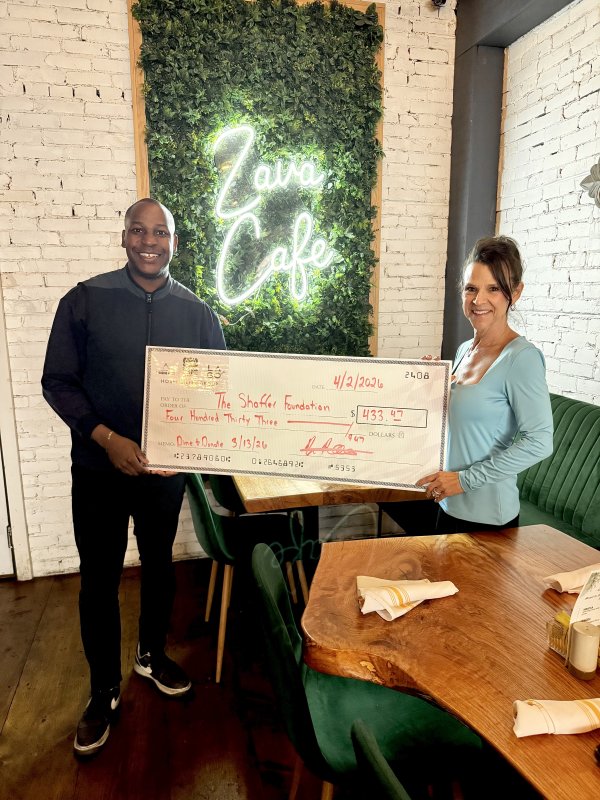 Gathered for the donation presentation are restaurant owner Preston Russell, left, and Kyle Shaffer, president of Shaffer Foundation of Delaware.