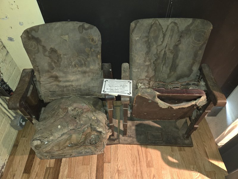 Before the new theater seats were installed, the old, water-soaked chairs from the flood of 1962 had been removed, and for awhile, Milton citizens brought folding chairs with their names written on masking tape. At the bottom of the flight of well-lit stairs to the recently renovated balcony are two of the original flood-soaked chairs that remind us of the past and help us appreciate the beautiful new chairs.
