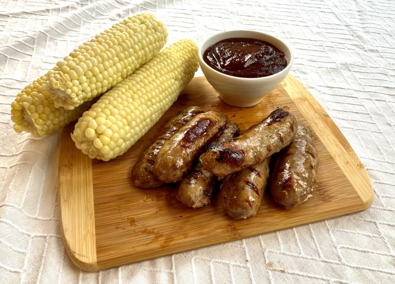 When we tried the moonshine barbecue sauce, I couldn’t detect any hint of alcohol, so the amount in the mixture was likely quite low. The sausages (we chose sweet, not hot) were tasty, but quite thick, so we had to split them lengthwise to keep them from burning on the outside before the interior was fully cooked. I love the flavor of fennel in Italian foods, but I wish they had crushed the seeds instead of leaving them whole.