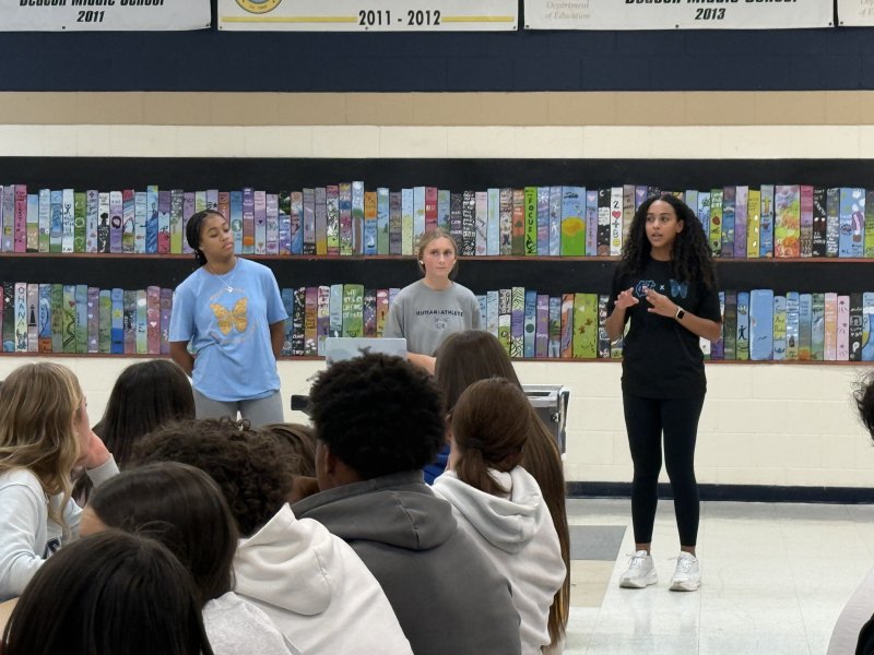 High school student leaders from Morgan’s Message visited the middle school to share the organization’s mission: To amplify the voices of student-athletes and promote open conversations about mental health. During the visit, they led an interactive presentation, shared personal stories, and guided students through activities focused on self-care, empathy and support for peers.