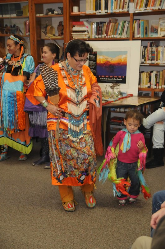 Linda Wright dances the Women’s Northern Traditional Dance. Joining her in the dance circle is Chitanitehe Ridgeway. Children are taught dances from an early age. When Chitanitehe Ridgeway heard the drum she immediately started dancing.