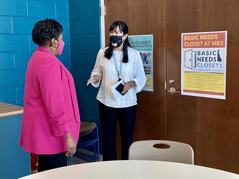 MES students Ky’leak Whaley, Carlee Cabello and Hannah McCabe led Pringle, Delaware State Education Association President Stephanie Ingram and other attendees on a tour of the newly remodeled school while Pringle spoke with school social worker Gloria Ho about her role.