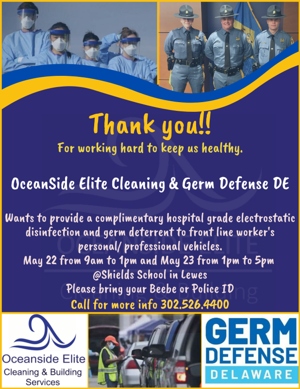 To show gratitude to Beebe Healthcare staff as well as police officers, Oceanside Elite Cleaning has teamed with Germ Defense Delaware to offer complimentary, hospital-grade electrostatic disinfection and germ deterrent to frontline workers’ personal and professional vehicles.