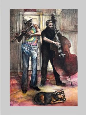 Warrell has had a long history with the Sun Ra Arkestra and modern jazz, as both an artist and presenter since 1976. The painting "Conference of the Birds” depicts musicians David Holland and Sam Rivers performing a duet in D.C. back in 1978, with Nick the Art Dog front and center.
