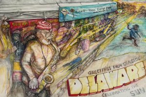 As a study for a proposed mural, Warrell recently created "Delaware Celebrates the Sun.” It is on display through Tuesday, April 7, in the Milton Arts Guild Curves exhibit at 107 Federal St., Milton. The subject recalls the 2024 fest, which celebrated the 100th birthday of Meastro Marshall Allen with a free performance of the internationally famous Sun Ra Arkestra.