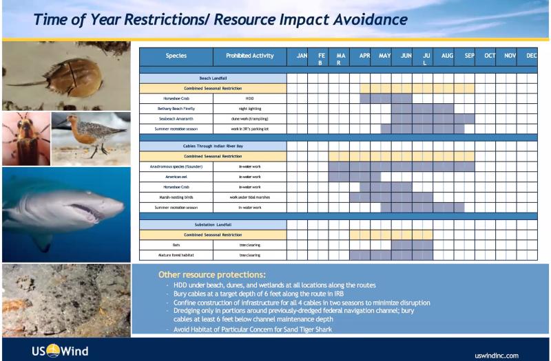 Two representatives from Delaware Department of Natural Resources and Environmental Control and one representative from US Wind made brief presentations on the permits needed and construction details. To make the connection work, the company would horizontally drill 60 feet under the beach and dune at 3R’s; build four vaults that are each 47 feet long, 12 feet wide and 11 feet deep in the beach parking lot; then horizontally drill west from the vaults under Indian River Bay before coming up at the power plant. In addition to the parking lot construction area, which is supposed to return to its as-is condition except for four manhole covers, and horizontal drilling, dredging in the coves near the plant requires permitting. In all, the company needs DNREC’s approval for a subaqueous lands permit, a water-quality certification, a wetlands permit and a beach preservation coastal construction permit.