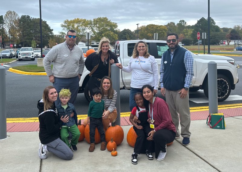 Gathered outside the Sussex Consortium and Little Vikings Preschool for the pumpkin delivery are in back (l-r) Christopher McPhail and Angel Payne, i.g. Burton Auto Group; Jennifer Williams, Sussex Consortium educator; and Chris Diaferio, i.g. Burton Auto Group. Students and staff in front are Kalee Cox, Cameron Kremkau, Camilo Perez Mejia, Elizabeth Cherico, Zayvin Cannon and Jaanai Chavez-Gaspar, volunteer.