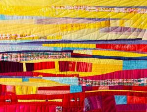 A self-taught art quilter who lives in Nantes, France, Bellas draws inspiration from the waterways of France for pieces featured in this exhibit on the walls of the Corkran. Mostly abstract, her art sometimes hinting at landscapes but is never completely representational. She mostly pieces and machine quilts, using fabrics inherited from her great-grandmother’s dowry - white cotton and linen sheets and tablecloths that she dyes and prints. Her colors are bold and bright, and, indeed, her focus is light and colors: she is well aware that the use of colors has a therapeutic effect on people,