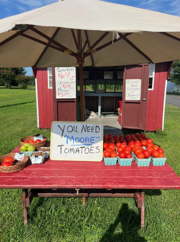 Now, all of you Lewes friends who I see stocking up on this staple at the Milton Food Lion, I have another well-kept Milton secret for you. My high school classmate Carol Ann Moore and her husband Glenn Moore, a seasoned and gifted farmer, sold the most succulent tomatoes ever at the little farmstand in front of their house on Cedar Creek Road. They are shutting it down at the end of this season, but the same red beauties can be found at their son Jeff Moore's produce stand on Route 30. Just head west out of Milton, and turn right at the traffic light at Kemp's Liquor store on Route 16, then follow the road a couple of miles and find this charming produce stand on the left.