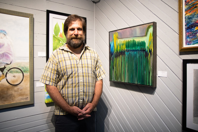 George Thompson is shown with his piece titled “Trickle Down Theory” which he described as an abstract acrylic piece inspired by the pollution that lurks beneath the surface of green spaces.
