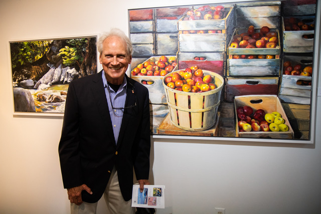 John Clendening is all smiles in front of one of his favorite paintings on display as part of his “Experiencing America’s Landscapes” display. Clendening said he went through a lot of apples to make this painting.