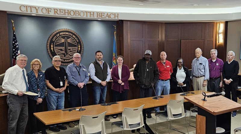 During a commissioner workshop Nov. 10, a proclamation was read aloud announcing Nov. 11, as Veterans Day in the City of Rehoboth Beach. After the proclamation was read, employees and members of the public were recognized. Shown are (l-r) Mayor Stan Mills, Shari Jevnick, Dave Hernandez, Greg White, Corey Shinko, Jean Hendershot-Lee, William Jones, Dave Diefenderfer, Sarah Smith, Walter Brittingham, Henry Matlosz and Commissioner Patrick Gossett.