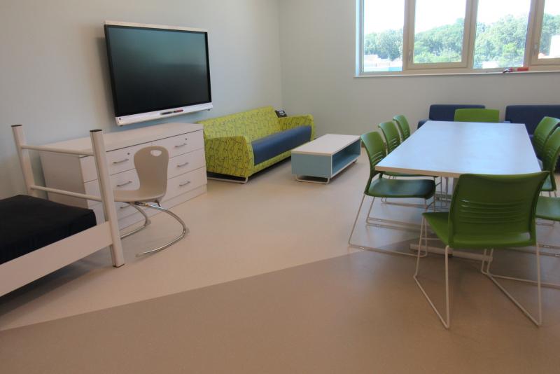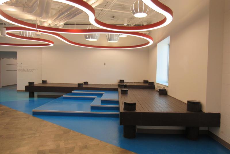 Students entering the building are greeted by natural sunlight and a water feature. As in previous construction, grade levels are separated and have different colors with collaborative workspaces.