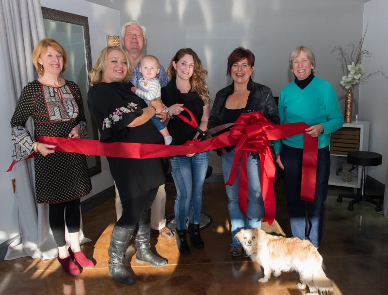 Lewes Chamber of Commerce held a ribbon cutting for Salon Fusion H2O at 33506 Crossing Ave., Unit 1, in the shops behind Walgreens at Five Points. Shown in back is Lewes Mayor Ted Becker. In front are (l-r) Betsy Reamer, executive director, Lewes Chamber of Commerce; Megan Lorenz, Salon Fusion H2O, office manager (holding London); Ashly Skibicki, London's mom and Salon Fusion H2O co-owner; Lori Zaiss, Salon Fusion H2O co-owner; and Bonnie Osler, Lewes City Council. Daisey the shop dog is at front right.