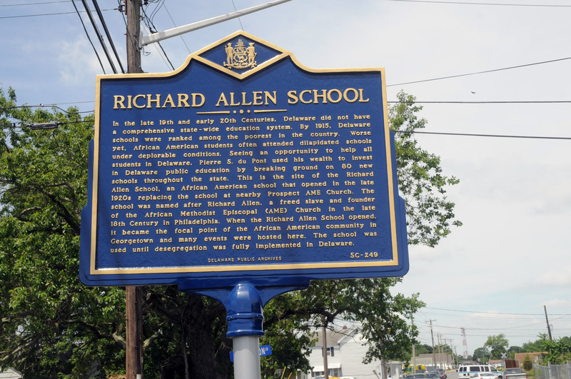 In the late 19th and early 20th Centuries, Delaware did not have a comprehensive state-wide education system. By 1915, Delaware schools were ranked among the poorest in the country. Worse yet, African American students often attended dilapidated schools under deplorable conditions. Seeing an opportunity to help all students in Delaware, Pierre S. du Pont used his wealth to invest in Delaware public education by breaking ground on 80 new schools throughout the state. This is the site of the Richard Allen School, an African American school that opened in the late 1920s replacing the school at nearby Prospect AME Church. The school was named after Richard Allen, a freed slave and founder of the African Methodist Episcopal Church in the late 18th Century in Philadelphia. When the Richard Allen School opened, it became the focal point of the African American community in Georgetown and many events were hosted here. The school was used until desegregation was fully implemented in Delaware.
