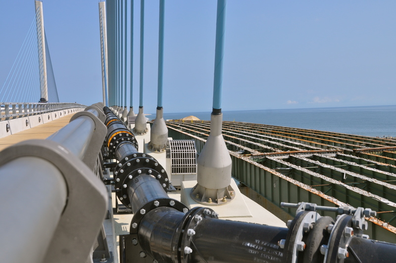 Sand has been moved via pipeline from the south side of the inlet to the north side for more than 20 years. The pipeline was attached to the ocean-side of the old bridge, which is the same place it's attached to the new bridge.