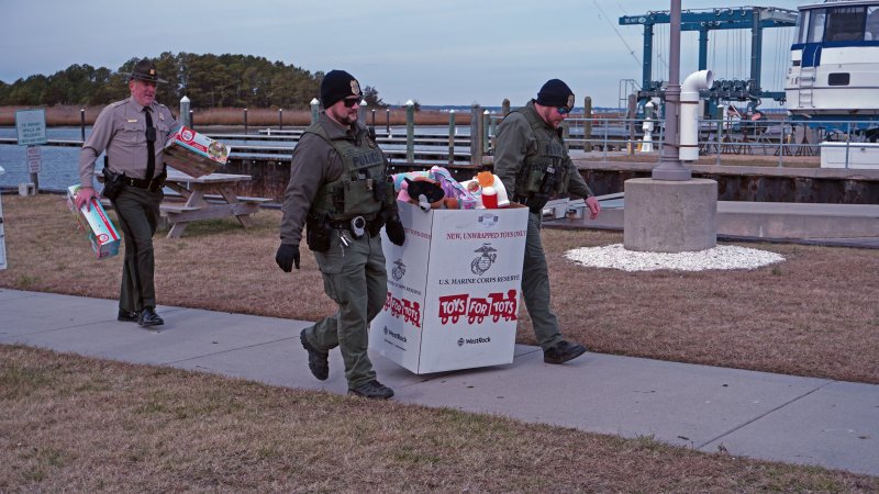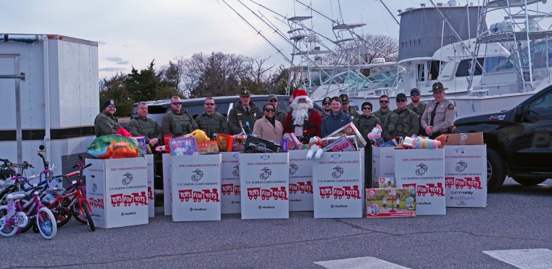 Delaware Natural Resources Police officers gathered Dec. 12 at the Indian River Marina to help Santa unload a boat full of donations for the U.S. Marine Corps Reserve Toys for Tots program.