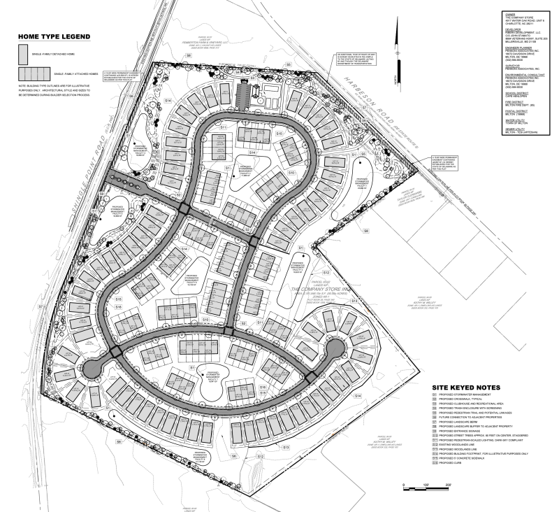 The residential portion of the development, which was annexed into town in 2023, would include 64 single-family detached units and 99 single-family attached units, along with a clubhouse and a proposed shared-use path. The 50-acre parcel is zoned R-1, residential, with a large-parcel development overlay. Plans call for the development to have 20-foot-wide streets throughout, 5-foot-wide sidewalks on both sides of the streets and street trees. Each house will have two parking spaces per dwelling, per code, and open spaces will include recreation areas, stormwater management ponds and landscaping along Harbeson Road and Shingle Point Road. Access to the development will come from Shingle Point Road.