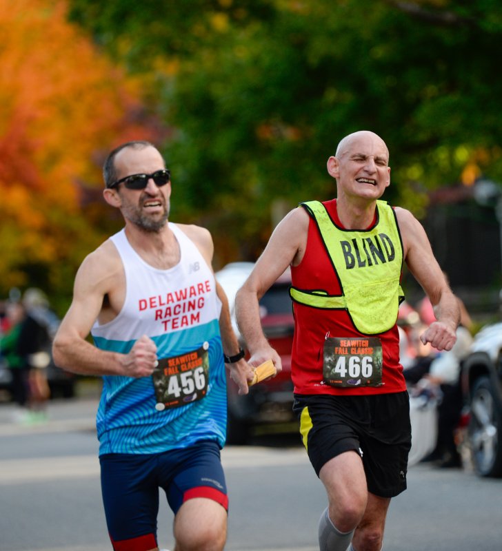 Ian Fleming - Ian, now 55, is a front-of-the-pack runner from England, just like Ian Fleming, the James Bond creator and author. I knew him when he was sighted and still know him after he lost his vision. He ran with a neon vest reading “Blind” and was tethered to a sighted guide. His guide at the Sea Witch 5K was Anthony Swierzbinski, 39, and together they ran 19:11, which is no joke. Before the race, I let Ian know I was there. “Hi, Ian, Fredman here. It’s good to see you.” He extended his right hand. “Was that a dumb way to greet you?” I asked as he just smiled. Anthony’s wife Elizabeth was women's champion in a fast time of 17:48.