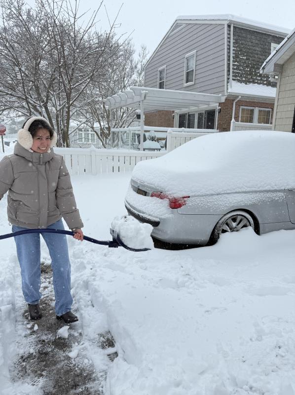 Gulya Mamasaidova, an exchange student from Kyrgyzstan, is no stranger to snow. She helps shovel the sidewalk in front of her Rehoboth Beach home. She loves school at Cape Henlopen High School but is happy to have a snow-day rest from her busy 11th-grade schedule. NANCY DOYLE PHOTO