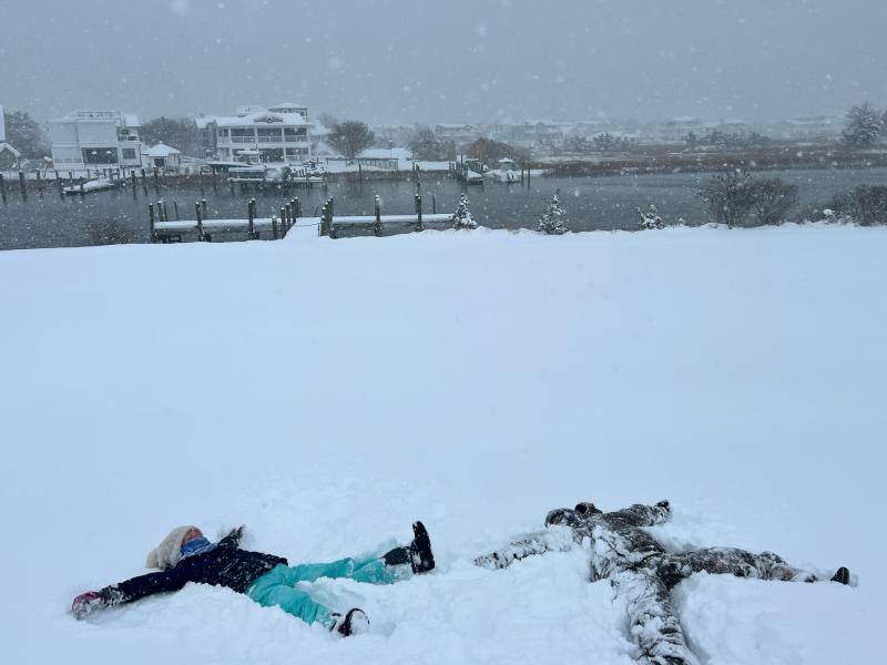 Brandon and Claire Brittingham make snow angels along the Lewes-Rehoboth Canal. CAROLINE BRITTINGHAM PHOTO