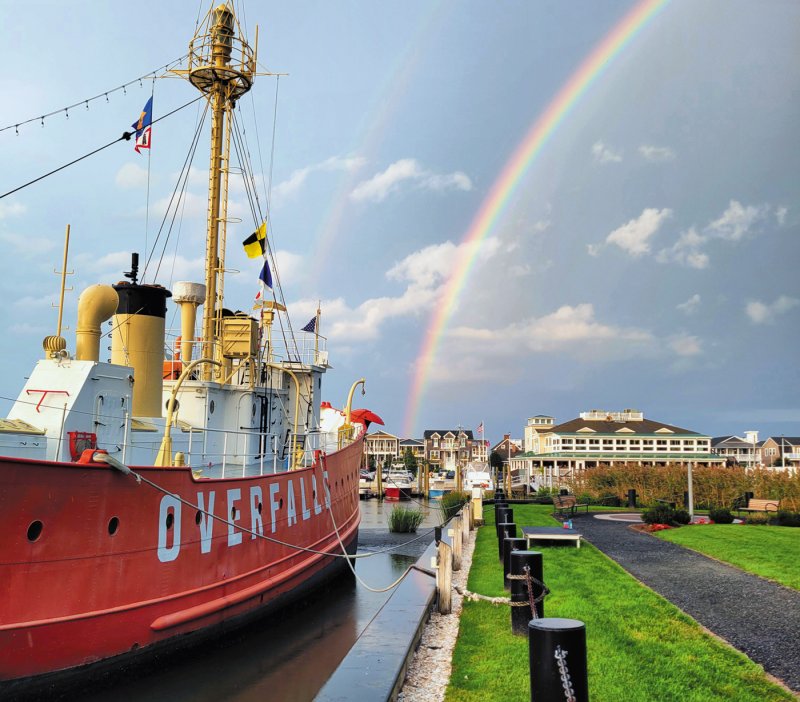 The historic Lightship Overfalls shines under a clearing sky in Lewes as a vibrant rainbow arcs over Canalfront Park.
