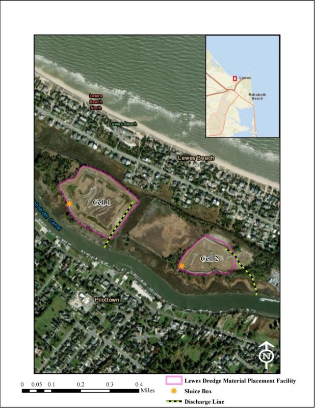 The original permit calls for all of the dredged sediment to be pumped to two placement sites between the canal and Lewes Beach. However, the Army Corps has submitted an application to the state requesting that about 60,000 cubic yards of the total be used to benefit an ongoing shoreline stabilization project being done by the Center for the Inland Bays and to benefit a future construction project at Sussex County’s Wolfe Neck Regional Wastewater Facility.
