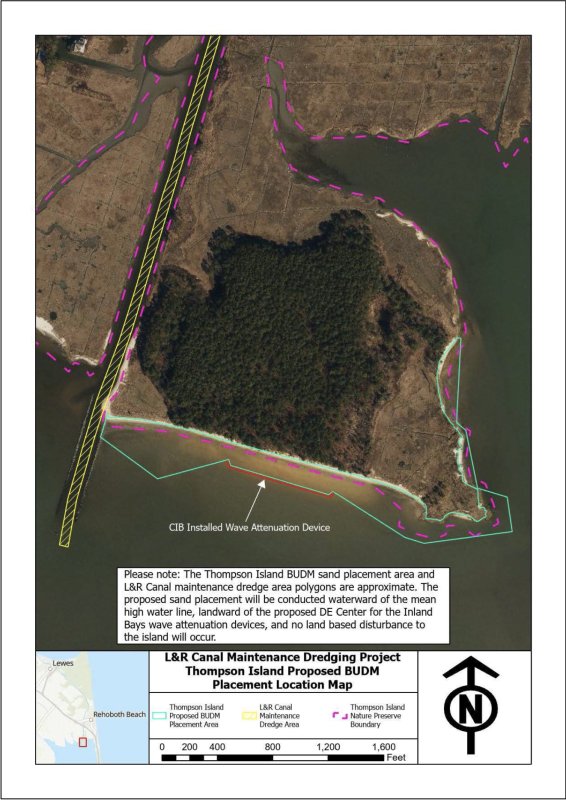 According to a request letter included with the notice, the Army Corps is proposing to place 28,000 to 30,000 cubic yards of high-quality sand along the Rehoboth Bay shoreline of Thompson Island, which is part of Delaware Seashore State Park and was dedicated as a nature preserve in 2000.