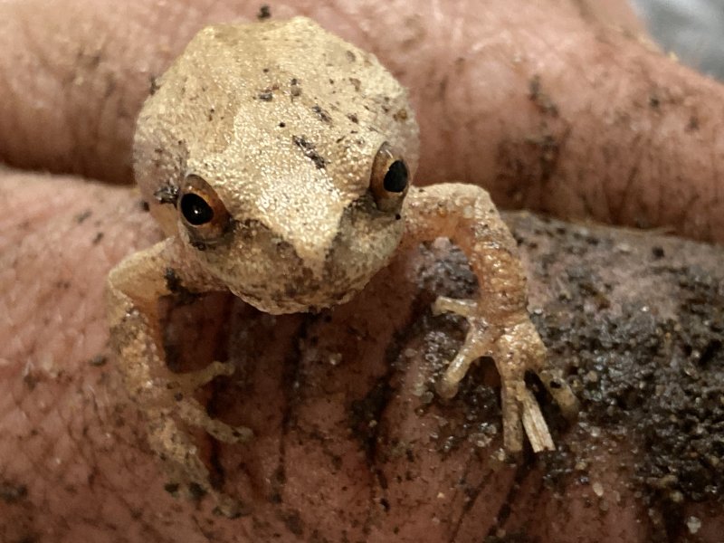 Plotting to catch an inattentive spring peeper (Pseudacris crucifer), I look around the wet brown leaves closest to a freshwater puddle. Vocal at night and silent by day, spring peepers are small! Adults are about 1 to 1.5 inches from nose to vent (body length) and weigh just over one-tenth of an ounce. Imagine the weight of two paper clips! Now, with size in mind, I’m looking for an amphibian sporting a camouflage color palette. Individuals may be various shades of green, olive, tan or brown highlighted with a distinct “X” shape on the back. These frogs often sit motionless, their large golden eyes masked by a wide, dark eye line. Twirl an old leaf by its stalk. Peepers also have dark bands on their pale legs, which coincidentally may match the width of a blade of grass or a leaf petiole (stalk).