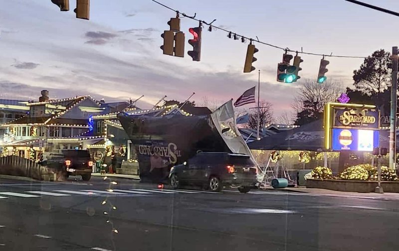 Blustery conditions Dec. 29 caused one of the large outdoor tents at The Starboard in Dewey Beach to blow into the shoulder of Route 1, creating temporary traffic delays for folks heading south through the town that evening.