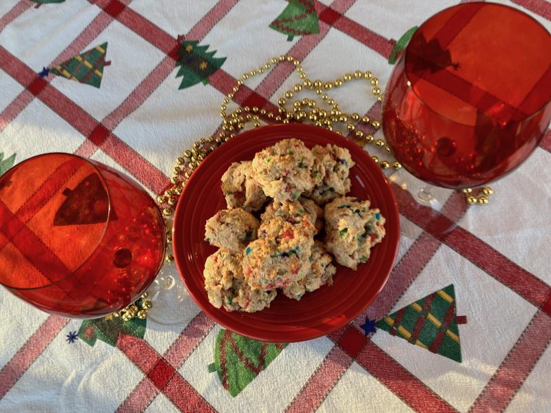 Preheat oven to 375 F. Line a baking sheet with parchment paper; set aside. Whisk together buttermilk and egg in a small bowl; set aside. Combine flour, baking powder, baking soda and salt in a mixing bowl. Cut butter into chunks and add to dry ingredients; cut in with a pastry blender to form fine granules. Stir in cranberries, sprinkles and sugar. Add buttermilk mixture and stir with a fork to form a soft dough. Turn out dough and knead into a ball, then flatten. Separate dough into eight pieces, forming each into a ball. Place balls onto prepared baking sheet. Bake until lightly golden, about 20 to 25 minutes. Remove to a wire rack to cool.