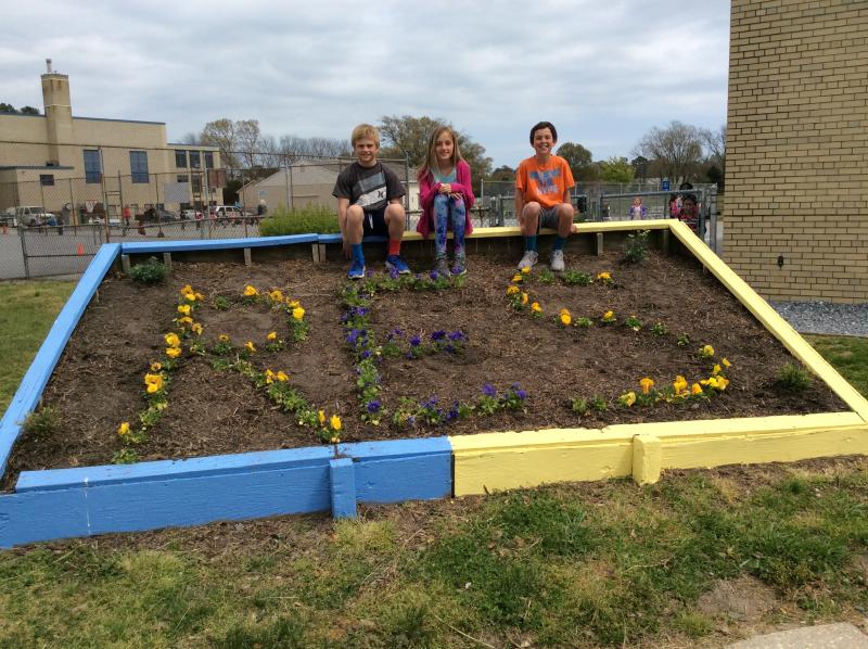 Rehoboth Elementary School fifth-graders add paint, flowers and their green thumbs to a garden sponsored by the PTO. Shown are (l-r) CJ Fritchman, Gracie Elder and Brady Lamb. SUBMITTED PHOTO