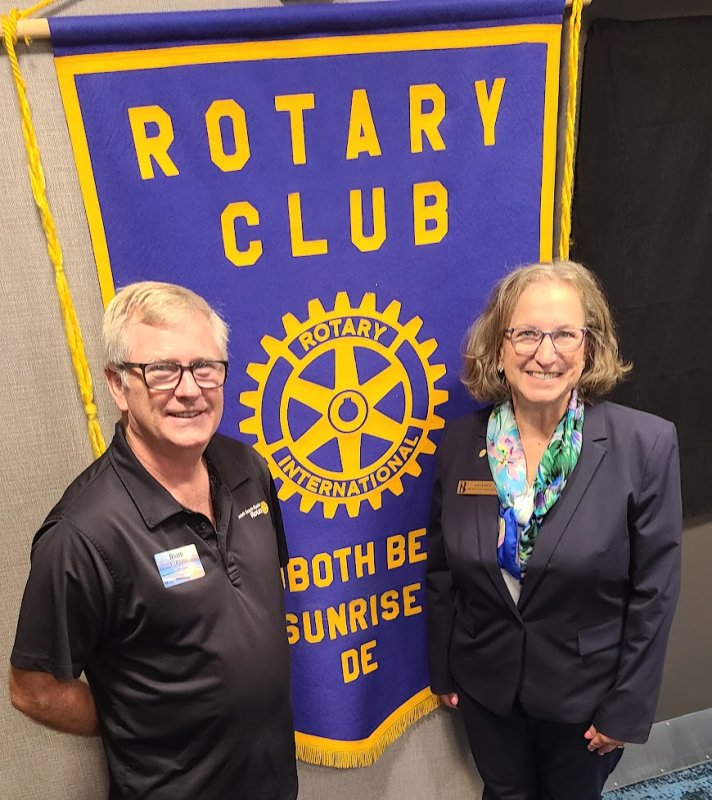 Sara Larch, the board vice chair for Beebe Healthcare, addressed Rehoboth Beach Sunrise Rotary Club members during a recent meeting. She discussed the healthcare challenges and opportunities facing Sussex County, and outlined Beebe Healthcare's strategies and programs to ensure high-quality healthcare in the Cape Region. Shown with Larch, right, is David Rowe, club president.