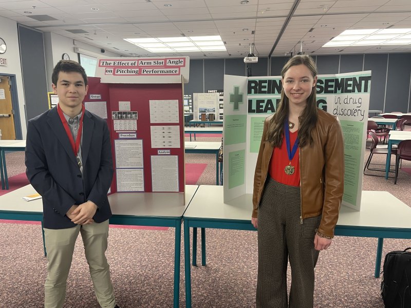 Sophomore Eva Navitskaya earned first place for her project in computer science, Using Reinforcement Learning to Speed Up Drug Discovery, and junior Jack Thomas received second place for his math research, The Effects of Arm Slot Angle on Pitching Performance.