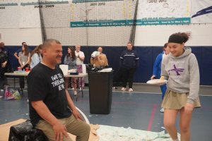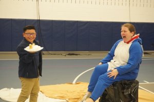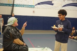 Staff donned their trash bags, shower caps, goggles and other protective gear March 16, and gathered in the school multipurpose room to await their turn for a student’s name to be pulled from a cup, winning the chance to pie that adult in the face.