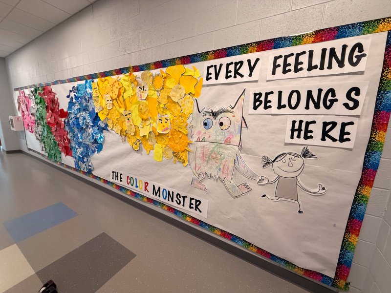 Each classroom was assigned a specific color tied to one of the emotions featured in the book. Students, teachers, specialists and support staff worked together to create original pieces of artwork representing their assigned feeling. Every member of the school community was invited to contribute, making the project a truly inclusive effort.