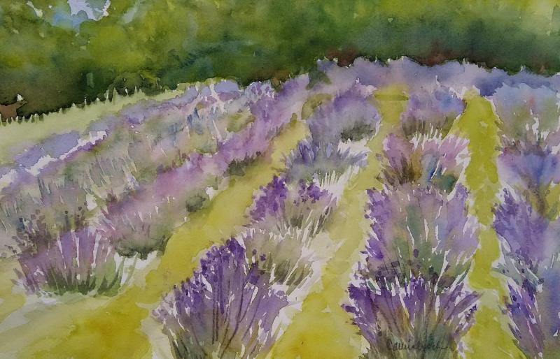 Cheryl Wisbrock’s watercolor painting, “Lavender Farm,” shows organized rows of lavender ready for harvest, using bright, complementary shades of yellow and purple.