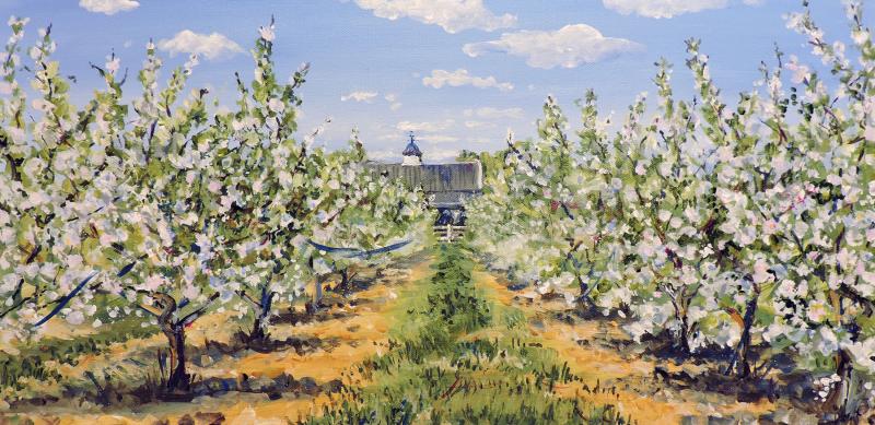 In Dale Sheldon’s acrylic painting, “Stag Farm Orchard,” the viewer glimpses a brief moment in time when apple blossoms are exquisitely in bloom, with a classic barn in the distance.