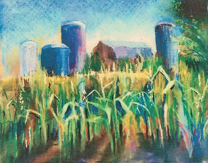 Joyce Condry’s pastel painting, “Delaware Cornfield,” fits the bill. The foreground is filled with colorful green cornstalks almost ready for harvest, providing a color contrast to the red barn and outbuildings in the distance.