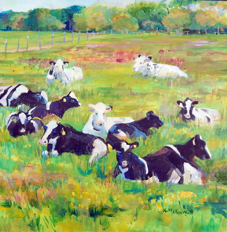 McCaskill’s acrylic painting, “Sitting Pretty,” depicts a roadside favorite, lovely Holstein cows relaxing in a colorful field of green grass and buttercups.