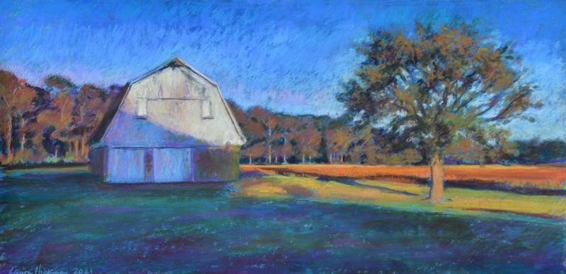 “Bayard Barn,” a pastel by Laura Hickman, lovingly depicts a lone barn sitting amidst the fields outside Ocean View, an iconic reminder of the family farms that once covered the local landscape.