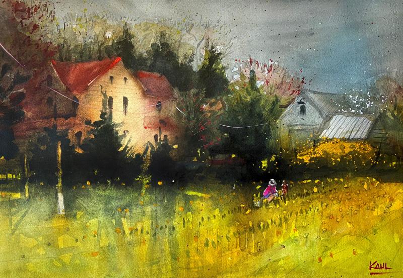 Leo Kahl’s watercolor piece, “Good Friday,” painted in loose, lush colors, portrays both a farm and a vignette of a mother and daughter collecting flowers from their unruly beds.