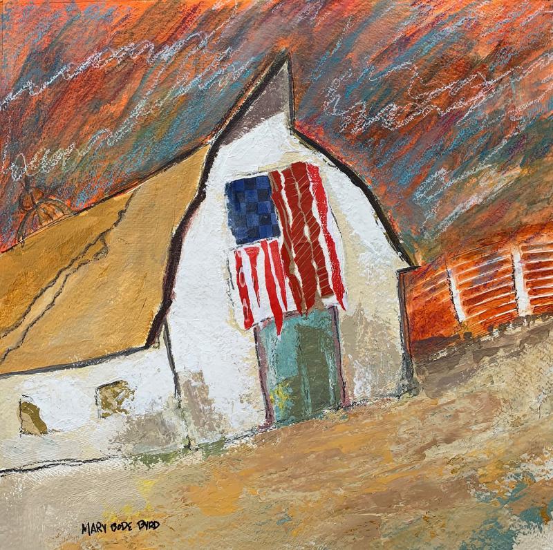 Mary Bode Byrd’s acrylic mixed-media painting, “Land of the Free,” depicts a jaunty Sussex County barn being utilized as a billboard for the American flag, lively and full of vibrant color.