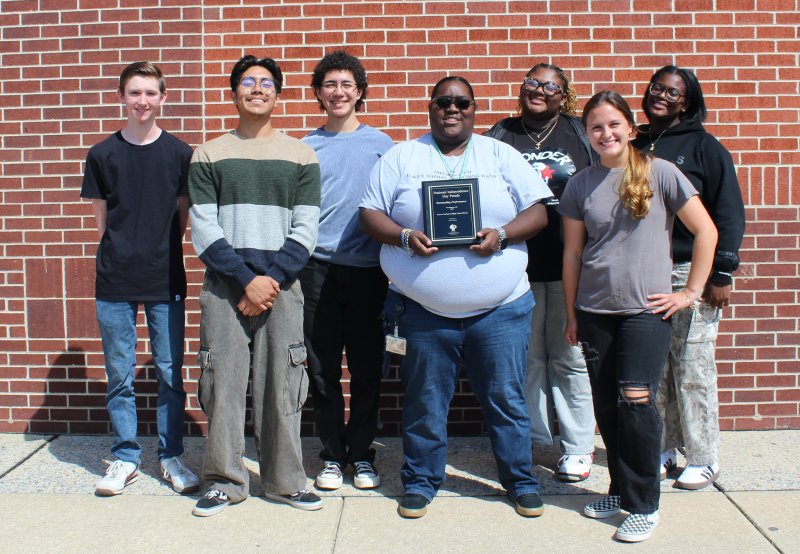 Sussex Tech Raven Nation Marching Band members gathered are (l-r) Lincoln Milspaw; Gerson Sotelo-Gabriel; Elias Garcia; Grace Batten, Sussex Tech band director; Jada Eley; Isabella Malandruccolo; and Sanai Youmens.