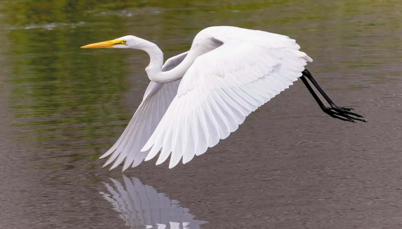 A Great Egret descends in a graceful glide, inches above the pond at Bay Pointe in Lewes.