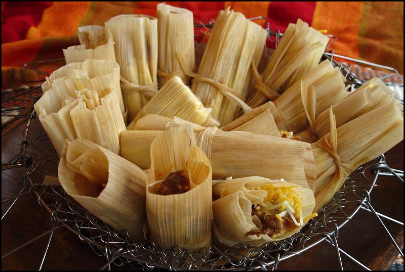 Serve tamales as soon as you can once they’re cooked, as the flavors are best when they’re warm. If they’re too dry, offer a garnish of salsa; if they’re highly seasoned with hot pepper, sour cream will sooth the burn. And, for your Oscar party, if you’d prefer not to make tamales, I’ve included a recipe for my favorite refried-bean and Rotel tomato dip - perfect with tortilla chips and champagne.
