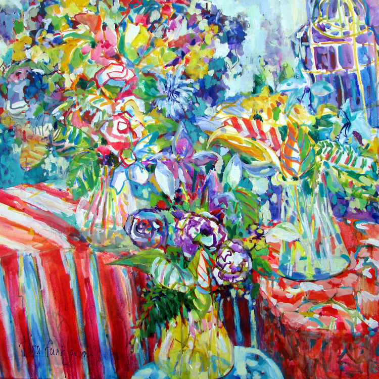 Inspiration comes from beautiful flowers, coastal and water themes, birds, the movement of theme parks and the landscape. However, most of the time the inspiration comes in the doing and what is happening with the materials on the canvas allowing her imagination to soar. There is almost always an aha moment when one brush stroke or shape determines the journey and ultimate meaning of the painting. Whether the paintings are executed in plein air or in the studio, they are full of motion, light and color. Even when she is painting a subject that is not moving, there is always the sense of dancing light and wind.