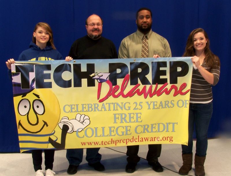 Tech Prep Delaware recently presented Sussex Technical High School with a banner in appreciation of its support of the statewide program. Through the Tech Prep program, students successfully meeting designated course requirements within career-technical pathways may be eligible to receive advance college credits. Shown accepting the banner are (l-r) Sussex Tech sophomore Meredith Husar of Milton, Tech Prep business liaison Carmen Strollo, Sussex Tech Principal Dr. John Demby and Sussex Tech senior Rebecca Southmayd of Ocean View.